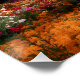 An ancient tree heavy with brilliant magenta-pink blossoms arches over a lush, sunlit garden paradise. Symmetrical beds overflow with intense orange, yellow, purple, hot pink, and white flowers framing a winding stone path that leads to a tranquil pond reflecting distant palms and rugged mountains. White colonial buildings nestle among tropical greenery under a perfect blue sky, creating an atmosphere of pure joy, abundance, tranquility, and timeless natural beauty. Perfect for living rooms, sunrooms, bedrooms, home offices, meditation spaces, bathrooms, or as uplifting gifts for gardeners, nature lovers, wellness seekers, or anyone who finds peace and happiness in vibrant, flourishing landscapes.