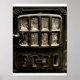 Un lourd poêle de salon antique orné d'un lourd amortissement en fonte avec de petits charbons brillants et une porte lourde et ornée devant. Le verre de la porte est depuis longtemps cassé, et a été remplacé par du maille métallique et du papier d'aluminium vieilli pour une apparence de grunge unique.