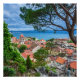 Vue sur la petite ville Omis entourée de montagnes, rivière Cetina et mer, Riviera Makarska, Croatie. Vue sur le pin, le vieux centre ville avec les toits rouges et bleu voir