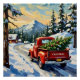 A timeless vintage Christmas illustration featuring a red pickup truck hauling a festive evergreen tree through snowy woods. A nostalgic holiday favorite.