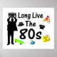 Montrant quelques-unes des choses amusantes des années 80! Un homme avec boombox sur la tête, un casquette fedora, un appareil photo instantané, un skateboard néon, une paire de baskets néon, un téléphone rotatif, un bloc-notes néon avec les mots "est allé à l'arcade".