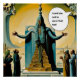 A surreal setting features a large central figure with exaggerated headwear and features, surrounded by figures as one of the floating head makes a comment.