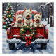 Brighten your holiday season with this adorable West Highland White Terrier Christmas design! This festive image features three snowy-white, cheerful West Highland White Terriers (Westies) enjoying a ride in the back of a classic red pickup truck, nestled in a picturesque snowy winter forest. The truck is charmingly decorated with a vibrant Christmas wreath, adorned with sparkling red and gold ornaments and warm, glowing lights. Soft snowflakes gently fall, creating a magical winter wonderland. With a decorated Christmas tree in the background, this design is perfect for capturing the joyful spirit of the holidays and makes an excellent Christmas gift for any Westie owner, dog lover, or admirer of festive dog breeds.