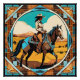 Portrait d'une femme sur un cheval avec un arrière - plan du désert et une frontière abstraite. Créé avec l'aide de l'IA à partir d'une conception originale de la mienne.