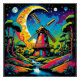A.I.a créé une impression de sous un ciel psychédélique surréaliste rempli de divers corps célestes, un moulin à vent dynamique est entouré d'un paysage de végétation luxuriante et jungle réfléchie dans un plan d'eau adjacent.