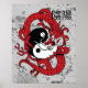 Symbole chinois de Yin yang et affiche du dragon qui montre un dragon tenant le symbole yin yang 陰 symbole 陽 et le caractère chinois du yin yang en noir, blanc, rouge et gris.