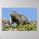 Young Alpine marmot (Marmota marmota) on the blue sky background, in the French Alps, Savoie department at La Plagne
