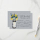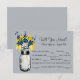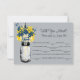 Carte LIB RSVP assortie parfaite pour un mariage de style champêtre ou peut-être que vous aimez simplement les pots Mason ! Pot Mason suspendu à un crochet rempli de fleurs sauvages champêtres. Un fond gris argent clair et un pot Mason suspendu avec des fleurs sauvages dans des tons de marine et de jaune. Si vous avez des questions sur ce design ou si vous souhaitez une modification de couleur, veuillez m'envoyer un e-mail à paula@labellarue.com Vérifiez également les cartes RSVP, RÉCEPTION et PLACEMENT DES INVITÉS pour assortir !