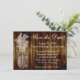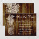 Cartes de faire-part de mariage "Save the date". Image tamponnée d'un pot Mason en blanc, sur un fond d'image de planches en bois brun foncé (pas de bois réel). Un thème extérieur semi-grunge pour un mariage d'été à la campagne ou dans une cabane. Des planches en bois brun chocolat foncé provenant d'une clôture ou de planches de sol antiques contrastent avec une image découpée en blanc tamponnée d'un pot Mason avec de la respiration de bébé et d'autres fleurs sauvages en dentelle. Tous les dessins, Copyright © www.CustomInvitesOnline.com