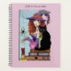 Une mignonne sorcière rousse tout en violet avec son chat noir assis sur une pile de livres, Potions, araignée et bougie dans un fond de rose.
