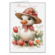 Adorable, blanc canard de Pâques portant un joli, printemps, casquette de paille avec de jolies fleurs et arc en satin rose. Elle a également un arc rose foncé autour du cou et est assise dans un jardin rempli de jolis Daffodils et Tulipes. L'intérieur a un accueil mignon et des lapins assis dans un champ de fleurs printanières colorées.
