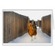 Une grande poule marche dans la neige entre de grandes barrières brunes - une image surréaliste d'un oiseau marchant par un labyrinthe des murs en bois