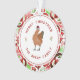 Illustration d'un poulet portant un chapeau de Père Noël entouré de "Joyeux Noël" avec du texte voûté de nom de famille et des baies sèches sur cercle blanc avec une bordure rouge. Arrière - plan est rouge et vert motif d'aquarelle inspirée de l'.