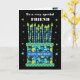 Une carte d'anniversaire brillante pour votre ami, avec beaucoup de bougies à motifs sur un gâteau d'anniversaire. En haut de la couverture, les mots "À un ami très spécial" sont en blanc sur l'arrière - plan noir. Il y a un groupe bleu autour du gâteau avec "HAPPY BANTHDAY !" également en blanc. Les petites étoiles bleues, vertes et blanches sont éparpillées autour de l'arrière - plan noir et le verset intérieur n'est qu'une suggestion, que vous pouvez facilement changer ou supprimer si vous le souhaitez.