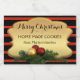Un étiquette festif pour vos biscuits de Noël faits maison ou d'autres goodies avec un design imprimé or avec des rayures d'or rouge sur un arrière - plan noir avec des brindilles de pin et des billes de Noël.