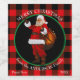 Une image du Père Noël habillé de son costume et de son bracelet rouge et blanc traditionnel est au centre de ce étiquette cadeau de Noël. L'image est placée sur un arrière - plan en cercle noir et encadrée en vert. Le texte en blanc a votre salutation personnalisée et signature sur un arrière - plan de buffle rouge et noir plaid.