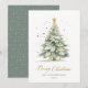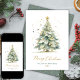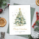 Calligraphie Or Moderne Élégant Script Arbre de Noël Non Photo Cartes de Noël. Ce Carte de fin de année de Noël simple et festif est doté d'un arbre de Noël aquarelle avec des boules d'or et des confettis décorés et d'un texte de bienvenue "Joyeux Noël" écrit dans un joli type de police lettré à la main en or et blanc. Sur la parties scintillant dorée à l'envers, neige ou confetti doré brillant sur arrière - plan vert poussiéreux. Ces cartes de Noël personnalisées et festives sont une excellente façon de rappeler à ceux que vous aimez que vous y pensez cette saison des Fêtes d'hiver.