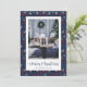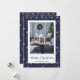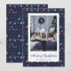 Cartes nostalgiques de Noël en pull bleu, rouge et blanc avec le Père Noël, rennes, flocons de neige, arbres et billes. Personnalisez facilement ces laides cartes de Noël avec votre photo et votre nom de famille.