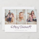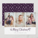 Des cartes photos de Noël Joyeux et violet personnalisés avec trois photos avec un titre calligraphique sur le devant et un arrière - plan violet avec des étoiles à l'arrière. Personnalisez facilement ces calligraphies violettes cartes photos de Noël avec vos images, un nom de famille et l'année.