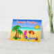 Conceptions ensoleillées de Mars de ©. Noël dans la scène de plage de l'Australie - carte de voeux de Noël avec une illustration tropicale de plage avec un palmier avec des décorations de Noël, des présents, un panneau de surf, parapluie de plage, serviette, boule, seau et pelle et lanières.