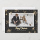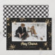 Belles cartes de Noël recouvertes de buffles noirs et blancs avec des flocons de neige brillants et des étoiles avec un titre de calligraphie or et un cadre photo. Un buffle noir et blanc plaçait l'arrière - plan à l'arrière.