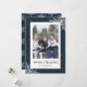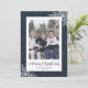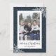 Cartes de Noël personnalisées avec titre de calligraphie et cadre photo bleu enneigé avec flocons de neige. Personnalisez facilement ces cartes bleues de Noël avec votre image et votre nom de famille.