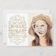 Carte photo élégant et moderne de Noël comportant votre photo de famille préférée. Illustré avec des flourishes beiges d'or, des remous et le style vintage de typographie sur un arrière - plan blanc. Fantaisie et élégant, il lit "ont Noël gai de houx" avec un manuscrit de fantaisie moderne. Envoyez les souhaits les plus chauds à la famille et aux amis avec cette belle carte.