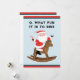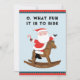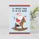 Cartes de fin de année de Noël équestres créatifs avec humoristique Santa Claus chevauchant haut dans la selle sur un cheval à bascule.