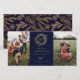 Élégant monogramme de couronne d'hiver doré, carte photo de vacances 2 en bleu festif. Fonctionnalités de carte correspondant au support motif et à plusieurs lignes de modèle pour votre accueil personnalisé.