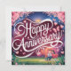 "Des tons vifs de rose et de violet créent un décor festif, orné de points confettis. Au centre, l'élégante police blanche et cursive annonce "Happy Anniversary". Deux personnages stylisés assis au parc, apportant une touche personnelle. Parfait pour commémorer un événement marquant dans une relation spéciale !"