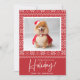 Cette modèle est une façon moderne et élégante de partager un accueil de vacances. Il présente un design festif rouge et tricoté Christmas Sweater avec un message "happy pawsome holiday" dans la calligraphie moderne sur un arrière - plan rouge. Ajoutez simplement votre photo préférée de votre chien et votre texte personnalisé pour compléter la carte.