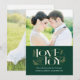 Cette carte de Noël élégante présente le message de bienvenue "Amour et Joie" en lettres et orné de pinces dessinées à la main. Ajoutez une photo de mariage à fond saigné au dos de la carte, ou cliquez sur "customiser" pour modifier la couleur arrière - plan pour correspondre à votre photo.