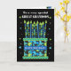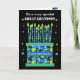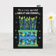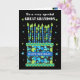 Une carte d'anniversaire brillante pour votre arrière-petit-fils, avec beaucoup de bougies à motifs sur un gâteau d'anniversaire. En haut de la couverture, les mots "À un GRAND GRAND GRANDSON très spécial" sont en blanc sur l'arrière - plan noir. Il y a un groupe bleu autour du gâteau avec "HAPPY BANTHDAY !" également en blanc. Les petites étoiles bleues, vertes et blanches sont éparpillées autour de l'arrière - plan noir et le verset intérieur n'est qu'une suggestion, que vous pouvez facilement changer ou supprimer si vous le souhaitez.