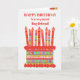 Vous pouvez ajouter l'âge à cette carte d'anniversaire aux couleurs vives pour votre petit ami, avec un gâteau d'anniversaire aux fraises. Le gâteau a beaucoup de bougies avec différents motifs et il y a une bande à motifs autour du gâteau avec des fruits d'été colorés - fraises, framboises, citron vert et tranches d'orange. Au-dessus du gâteau, l'accueil, en lettres rouges, est "HEUREUX ANNIVERSAIRE à un copain très spécial" et sur le gâteau il y a un espace pour ajouter l'âge, suivi par "ans today !" en lettres blanches. N'hésitez pas à customiser le message intérieur si vous le souhaitez ; vous pouvez changer la police et la couleur ainsi que le message.