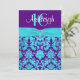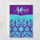 Ajoutez des tape-à-l'oeil et du charme à votre partie, Quinceanera, ou bat mitzvah du bonbon 16 avec ce pourpre chic, bleu de turquoise et invitation d'anniversaire de sweet sixteen de damassé de blanc avec un ruban bleu IMPRIMÉ de satin d'aqua et une broche IMPRIMÉE de bijou de diamant là-dessus. Si vous avez besoin de n'importe quels articles assortis dans cette conception, ou si vous avez besoin de l'aide la customisant avec votre information, envoyez svp niteowlstudio@gmail.com. Le **** NOTENT SVP que tout imprimera comme il apparaît sur votre moniteur. Je ne verrai pas votre invitation une fois que vous la commandez et Zazzle n'éditera rien.