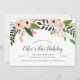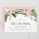 Élégantes invitations de fête d'anniversaire florales pour les premiers anniversaires, les anniversaires d'enfants ou tout âge, avec une bordure supérieure en cascade de fleurs roses et pêche avec une verdure botanique luxuriante. Personnalisez avec les détails de votre fête d'anniversaire en lettrage serif et calligraphie noir foncé.