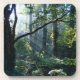 Des rayons blancs brillants du soleil matinal jaillissent de branches sombres vers une forêt estivale verdoyante, avec des arbres massifs recouverts de lierre et des pinces fertiles.
