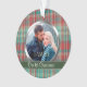 Cet ornement de vacances en saké dispose de votre propre photo dans un cadre de motif de Noël rouge et vert qui a une garniture intérieure en argent. Une bannière verte tient votre texte customisé ; faites-le dire comme vous voulez ! L'autre côté a la même bordure plaid avec du texte supplémentaire sur l'intérieur blanc. Un cadeau de conservation élégant et festif pour les jeunes mariés ou tout couple.