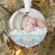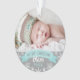 La bannière "My First Christmas" et le design de décoration de la photo de la frontière avec flocon de neige peuvent être personnalisés avec le nom du bébé garçon et l'année de naissance. Inclut une deuxième photo à l'arrière. Aqua / bleu turquoise, gris et blanc.