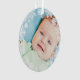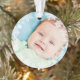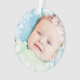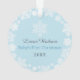 Élégant flocon de neige encadré premier ornement photo de Noël de bébé avec une couronne ronde de flocons blancs d'hiver qui encadrent la photo du nouveau-né du bébé garçon. Un message personnalisé "Baby's First Christmas" apparaît à l'arrière avec le texte qui peut être personnalisé avec le nom du bébé garçon et l'année de naissance. Les couleurs bleu bébé et gris ardoise peuvent être changées pour correspondre à votre photo !