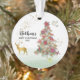 Les ornements de Noël commémorent le premier Noël du bébé. Vous pouvez customiser le nom du bébé, l'année de naissance du bébé et sur le dos "Maintenant nous sommes "numéro". Ce sont des étincelles d'or et de faux parties scintillant sur l'arbre. La façade est équipée d'une DOVE DE PAIX et d'un sapin de Noël décoré. L'arbre a beaucoup de poinsettias rouges. Il y a un faux cerf en or dans le arrière - plan avec un joli rack de bois. Un cadeau de l'arbre attend d'être ouvert.