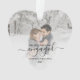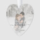 Commémorez votre fiançailles avec ce magnifique ornement en forme de coeur. Le texte noir indique "Notre premier Noël engagé", avec le mot "engagé" dans un élégant script d'écriture manuscrite avec des fioritures avant et après. Remplacez l'exemple d'image par votre photo préférée, et ajoutez vos noms et l'année. Un filtre en dégradé blanc permet de faire apparaître le texte.