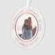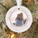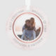 Cet ornement de Noël personnalisé présente un design d'or faux rose moderne sur arrière - plan en marbre rose. Personnalisez les noms, l'année et la photo. Ce modèle fonctionne mieux avec les photos au format paysage avec le couple au centre.