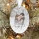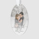 Commémorez votre fiançailles avec ce magnifique ornement de gardien moderne. Le texte en gris fusain dit "Notre premier Noël engagé", avec le mot "engagé" dans un élégant script d'écriture manuscrite avec des fioritures avant et après. Remplacez l'exemple d'image par votre photo préférée, et ajoutez vos noms et l'année. Un filtre dégradé blanc permet de faire apparaître le texte.