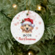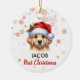 Ornement chrétien personnalisé, mignon chien de repérage d'or avec casquette de Noël, et citation de la bible sur le dos. Matthieu 1:18 "La naissance de Jésus-Christ a eu lieu de cette façon. Quand sa mère Marie avait été fiancée à Joseph, avant qu'ils ne se réunissent, on a découvert qu'elle était avec l'enfant de l'Esprit Saint."