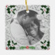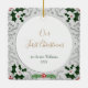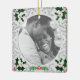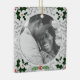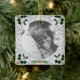 Porte photo de Noël vintage avec motif gris et feuillage classique dans les coins. Placez votre photo personnalisée sur le devant et customisez le dos avec votre nom et votre date dans une police élégante