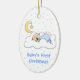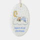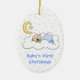 Le premier ornement de Noël de la petite fille douce est fait d'une céramique ovale avec un joli ruban. Graphiques d'un arrière - plan de pois bleu et d'un bébé endormi, sur un nuage, avec lune croissant au-dessus, et lecture de texte bleu personnalisable, Baby's First Christmas. À l'arrière de l'ornement est un point polka bleu, avec le texte bleu nom et la date de lecture. Personnalisez tout le texte pour le premier Noël de votre bébé ou comme un joli cadeau.