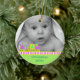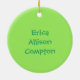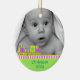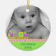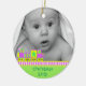 Le premier ornement de Noël de bébé doux fait d'une céramique ronde avec un joli cordon d'or. Des graphiques d'un train de jouets colorés comme un néon de couleurs bordant un arrière - plan vert clair, au bas de l'ornement, et une photo personnalisée, au haut de l'ornement. Le texte vert sur la partie inférieure et sur l'arrière est entièrement personnalisable. Personnalisez tout le texte et la photo de votre bébé, pour un doux premier Noël ou comme un cadeau de beauté pour les nouveaux parents ou grands-parents.
