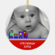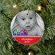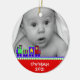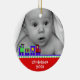 Le premier ornement de Noël de bébé doux fait d'une céramique ronde avec un joli cordon d'or. Graphiques d'un train de jouets coloré bordant un arrière - plan rouge, au bas de l'ornement, et une photo personnalisée, au haut de l'ornement. Le texte blanc sur la partie inférieure et sur l'arrière est entièrement personnalisable. Personnalisez tout le texte et la photo de votre bébé, pour un doux premier Noël ou comme un cadeau de beauté pour les nouveaux parents ou grands-parents.