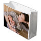 Grand sac cadeau de Noël de bébé blanc avec photo changeable et texte - vous pouvez ajouter votre photo, nom de famille et année. Photographie © Storytree Studios, Stanford, CA